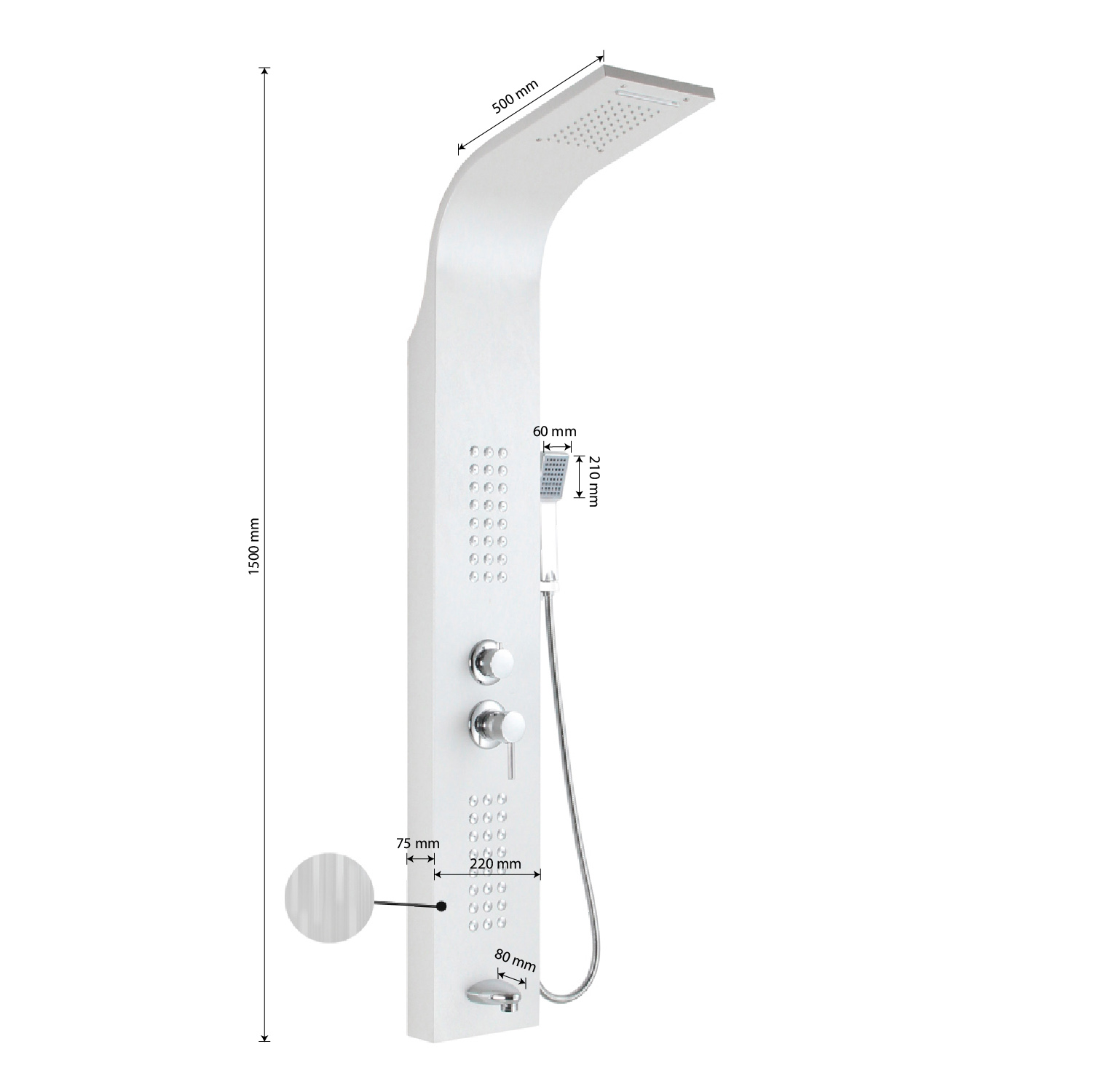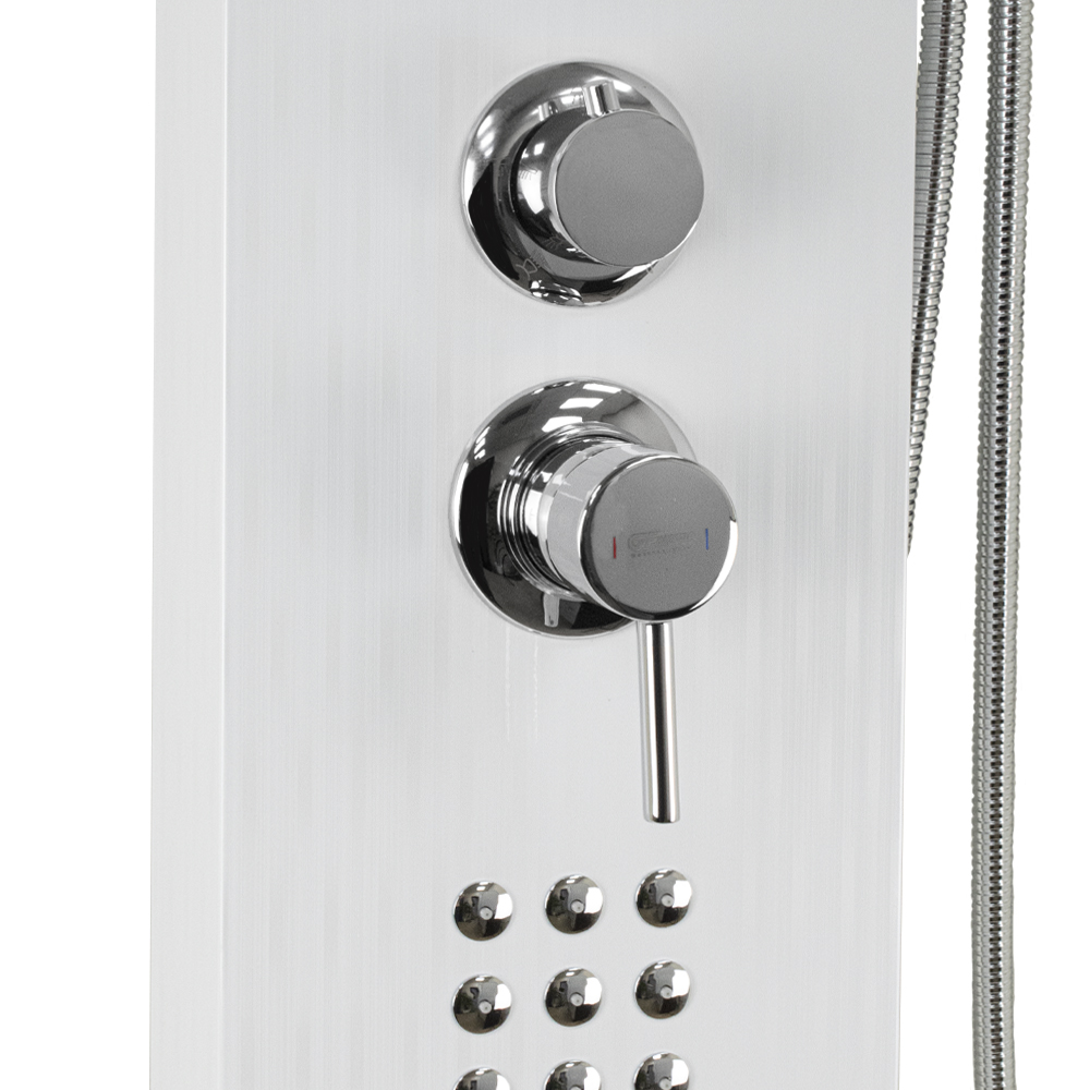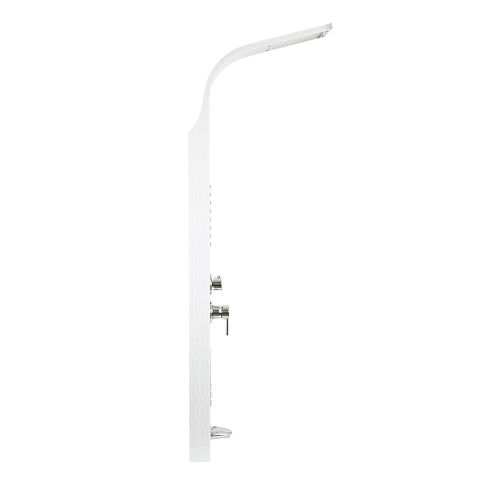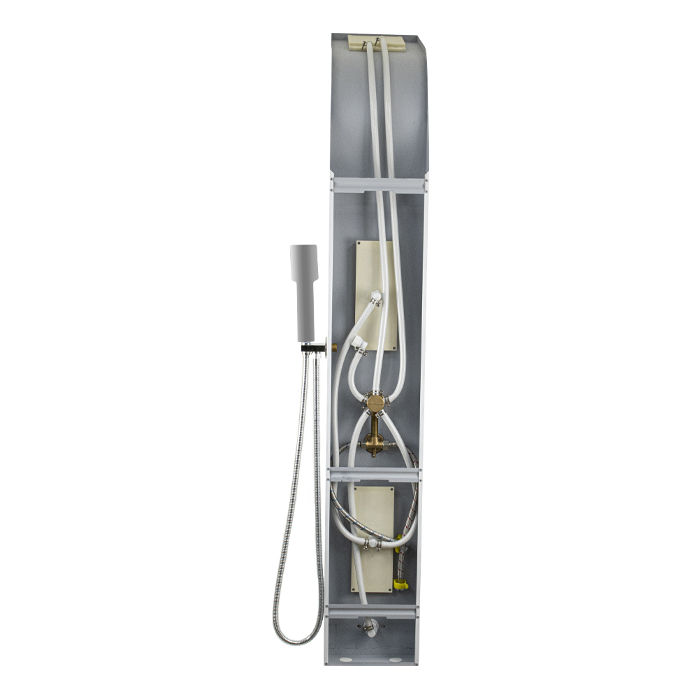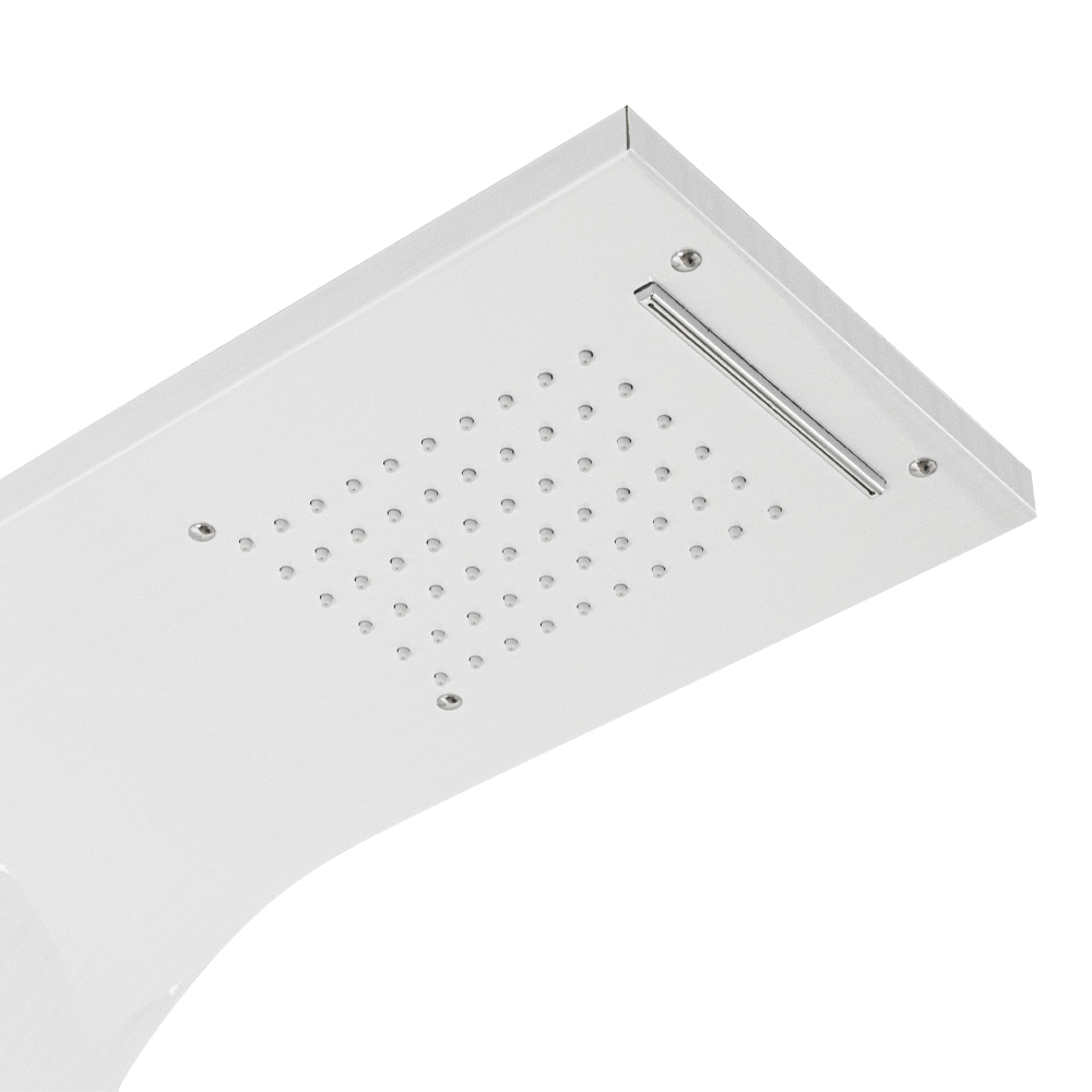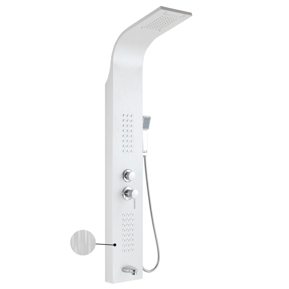 Ультрамодная дизайнерская разборная, гидромассажная душевая панель - "тропический душ" с двумя лейками и форсунками, 5 режимов работы, с коротким изливом. Функциональность обеспечивают тропический, верхний каскадный душ, ручная лейка и форсунки для массажа спины. Эффектный внешний вид и практичность эксплуатации придает изделию из нержавеющей стали марки 304 поверхность, высокопрочная плёнка под белый камень. Сочетание эстетики и максимального комфорта достигается за счет интегрированных гидромассажных форсунок и встроенного верхнего душа. Стильное и компактное оборудование предназначено для установки в ванну или любую душевую зону. Душевая панель позволит проводить оздоровительные процедуры в домашних условиях, гидромассажные форсунки окажут мягкое терапевтическое воздействие. Габаритные размеры: высота 1400 мм, ширина 220 мм, глубина 75 мм, длина верхнего душа 500 мм, длина излива 80 мм, длина шланга 150 см. Вес - 9,500 кг, объём - 0,16000 м3. Комплект: корпус / крепления / лейка / держатель для лейки / душевой шланг / излив / переключатель потоков / соеденительные шланги.