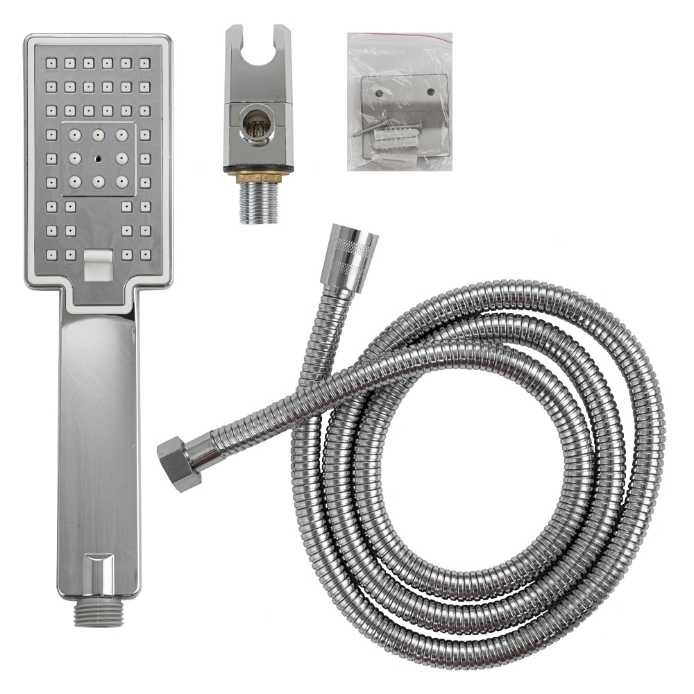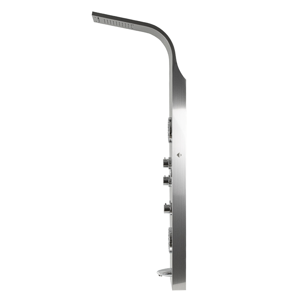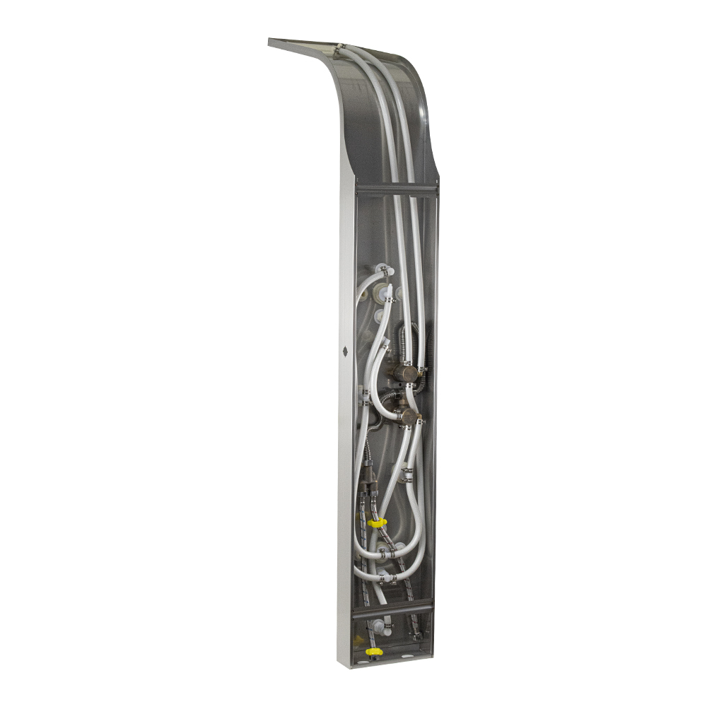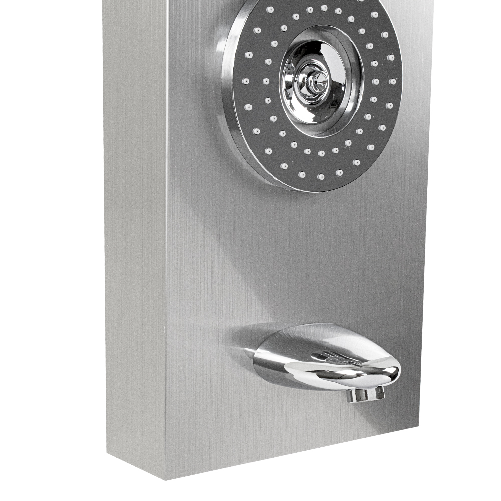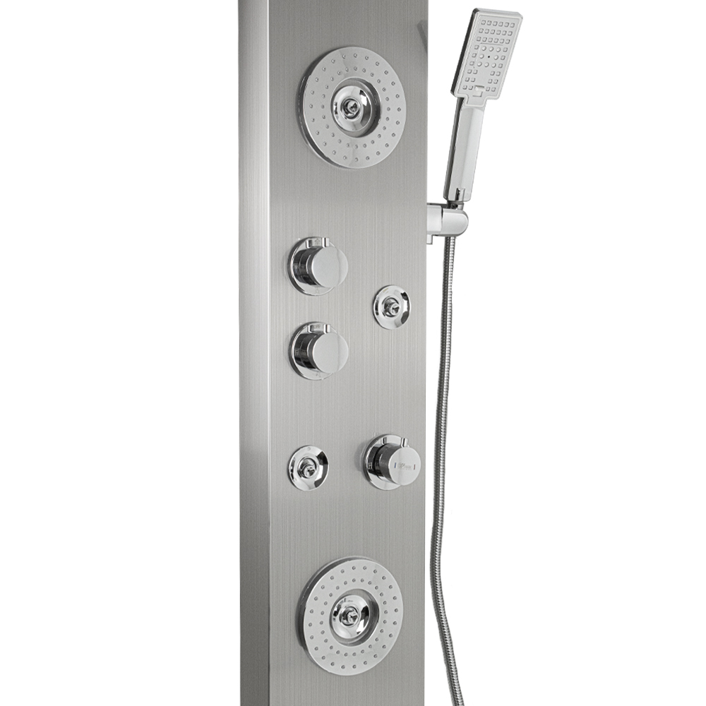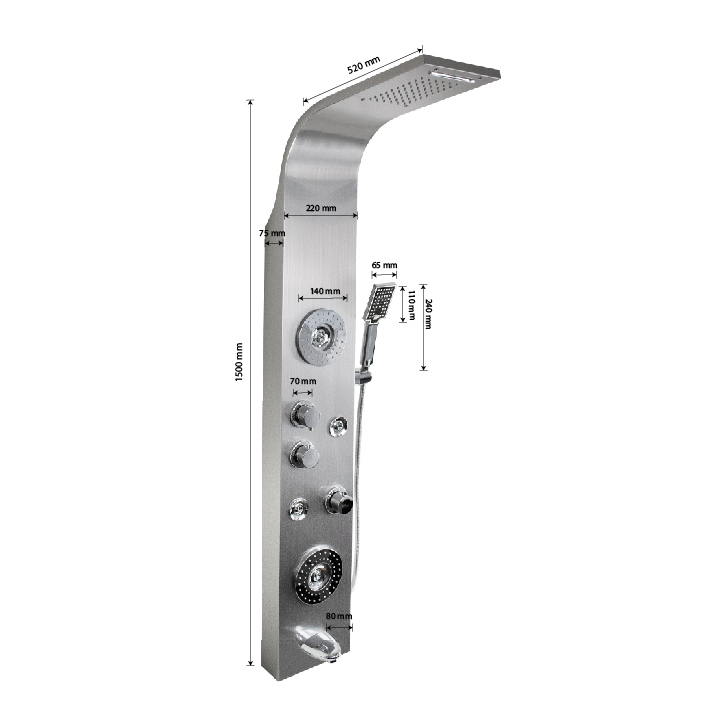 Ультрамодная дизайнерская гидромассажная душевая панель - "тропический душ" с двумя лейками и форсунками, 6 режимов работы, с коротким изливом. Функциональность обеспечивают тропический, верхний каскадный душ, ручная лейка и форсунки для массажа спины. Эффектный внешний вид и практичность эксплуатации придает изделию из нержавеющей стали марки 304 матовая зацарапанная поверхность. Сочетание эстетики и максимального комфорта достигается за счет интегрированных гидромассажных форсунок и встроенного верхнего душа. Стильное и компактное оборудование предназначено для установки в ванну или любую душевую зону. Душевая панель позволит проводить оздоровительные процедуры в домашних условиях, гидромассажные форсунки окажут мягкое терапевтическое воздействие. Габаритные размеры: высота 1500 мм, ширина 220 мм, глубина 75 мм, длина верхнего душа 520 мм, длина излива 80 мм, длина шланга 150 см. Вес - 10,000 кг, объём - 0,020000 м3. Комплект: корпус / крепления / лейка 2 режима / держатель для лейки / душевой шланг / излив / переключатель потоков / соеденительные шланги.