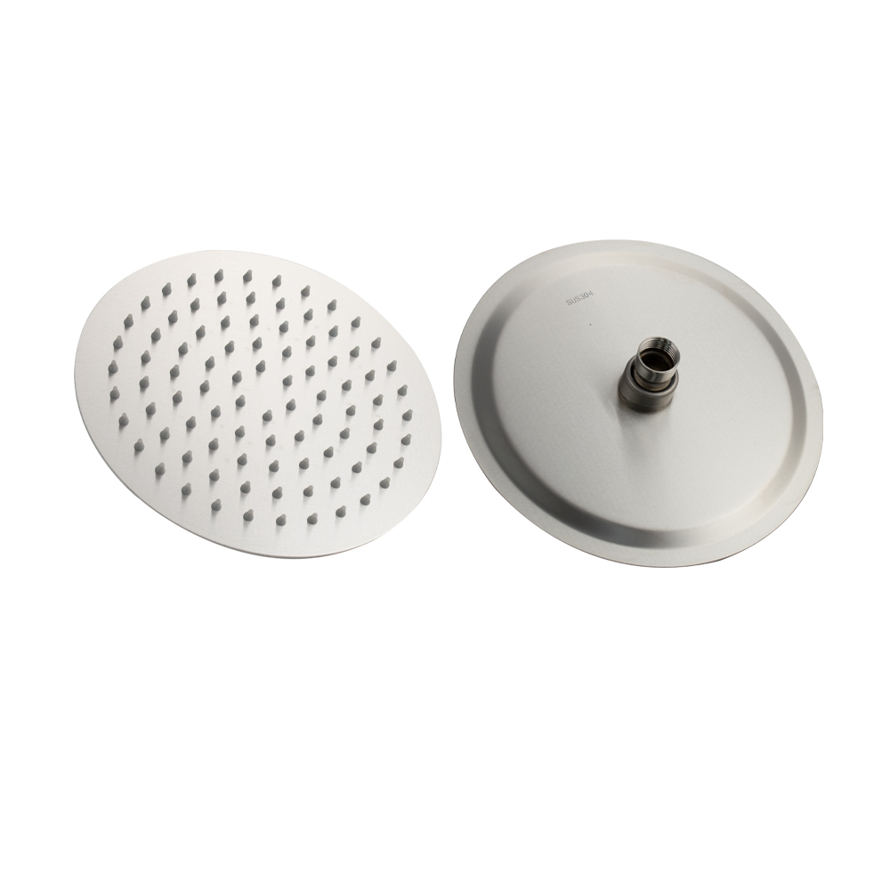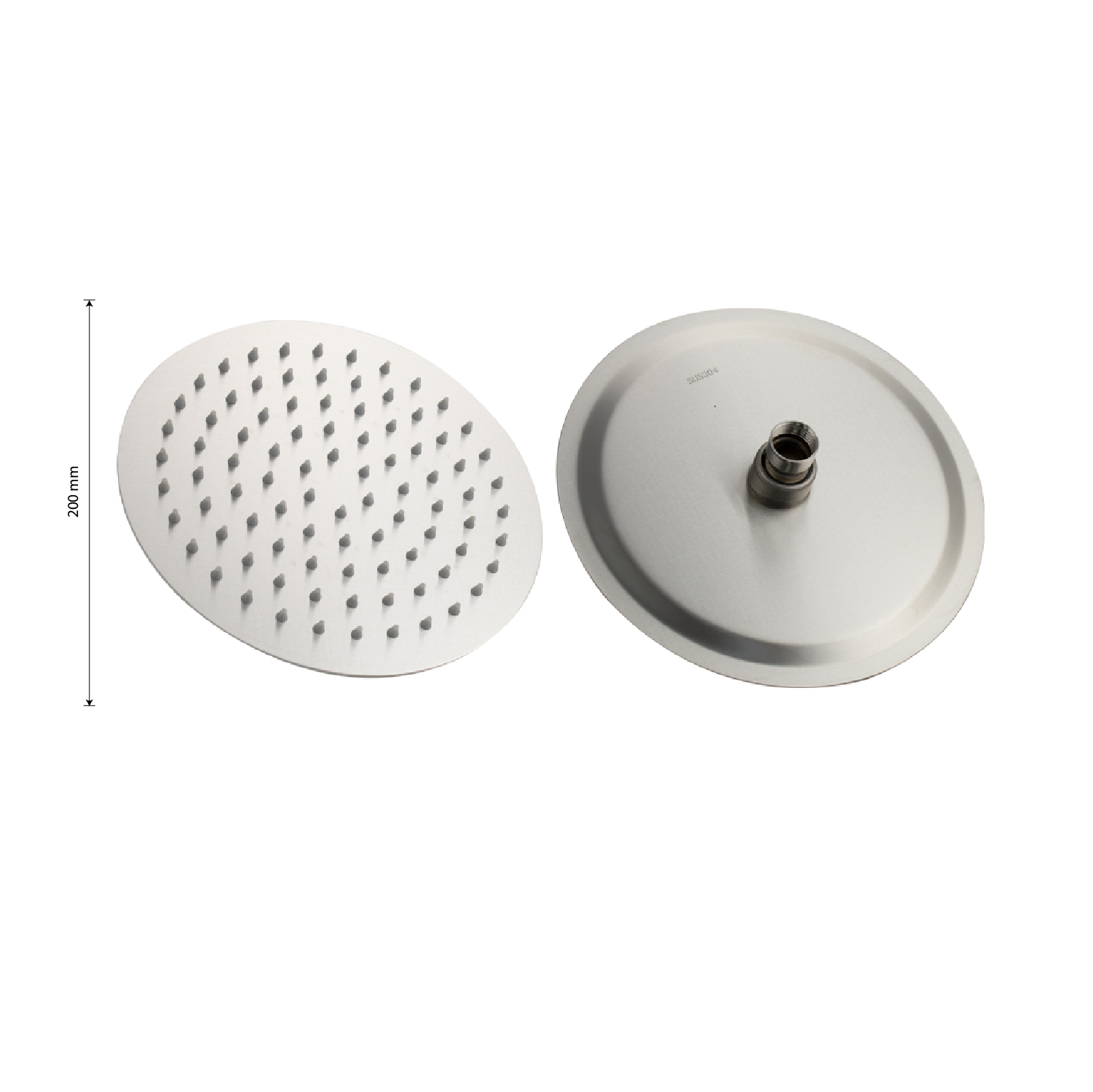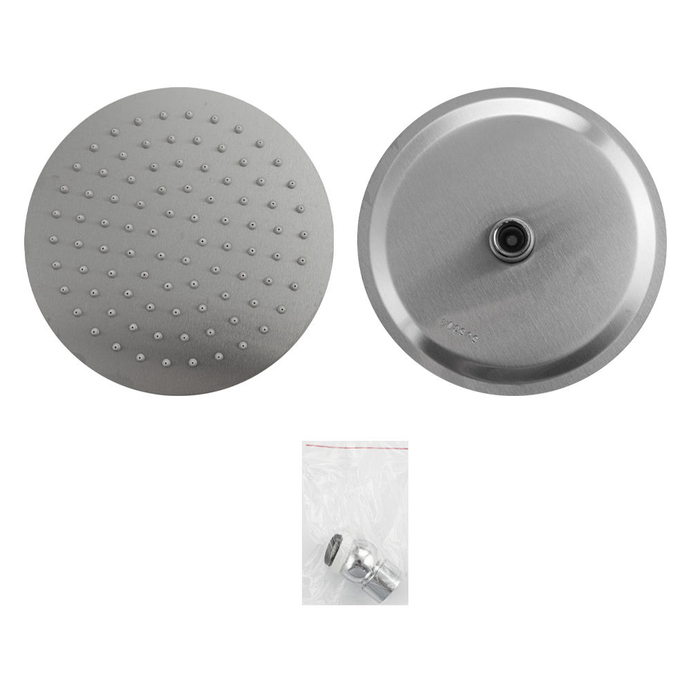 Душевая лейка тропический душ круглая, отличается современным технологичным дизайном, высокой надежностью, долговечностью. Она изготовлена из нержавеющей стали марки SUS 304 и имеет декоративное матовое покрытие, придающее устройству привлекательный вид и предохраняющее от агрессивного воздействия окружающей среды. Корпус отличается небольшим весом, что исключает повреждение напольной плитки или эмали ванны при случайном падении. Лейка крепится к штанге при помощи шарнирного соединителя, внутрь которого встроен сетчатый аэратор для равномерного распределения воды. Также шарнирный соединитель позволяет менять угол наклона душевой насадки от 0° до 22°. Конструкция душа создает эффект тропического ливня, делая водные процедуры приятными и комфортными. Ухаживать за душевой лейкой легко. Глянцевую поверхность достаточно протереть мягкой салфеткой, она в течение долгого времени не потеряет своего блеска. Система помогает мгновенно очистить силиконовые форсунки душевой лейки от известкового налета и загрязнения. Габаритные размеры: диаметр 200 мм, толщина 10 мм. Вес - 0,600 кг, объём - 0,00264 м3.